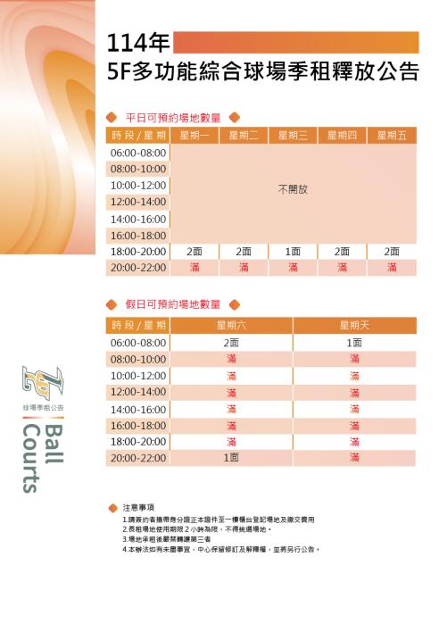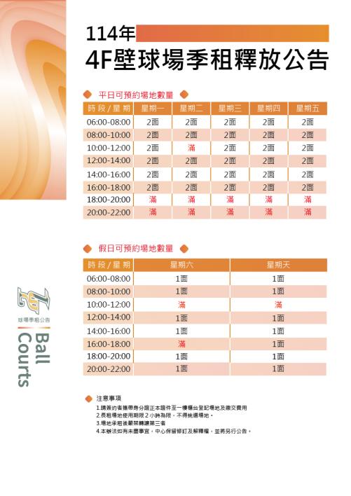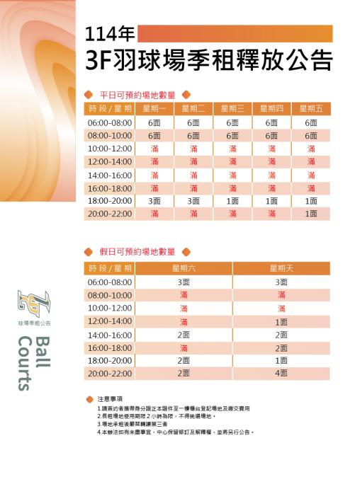【114年 球場球場季租空場釋放公告】 注意事項 1.簽約者攜帶身分證正本證件至一樓櫃台登記場地及繳交費用。 2.季租場地使用期限2小時為限,不得挑選場地位置。 3.場地承租後嚴禁轉讓第三者。 4.本辦法如有未盡事宜,中心保留修訂及解釋權,並將另行公告。 若有任何季租問題,歡迎您私訊粉專洽詢 #新北市 #蘆洲國民運動中心 #球場 #羽球 #籃球 #壁球 #綜合球場