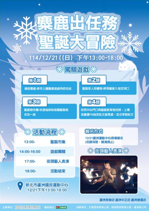 日期:114/12/21(日) 時間:13:00-18:00 活動地點 : 蘆洲國民運動中心 一樓外廣場 活動報名:蘆洲運動中心現場報名