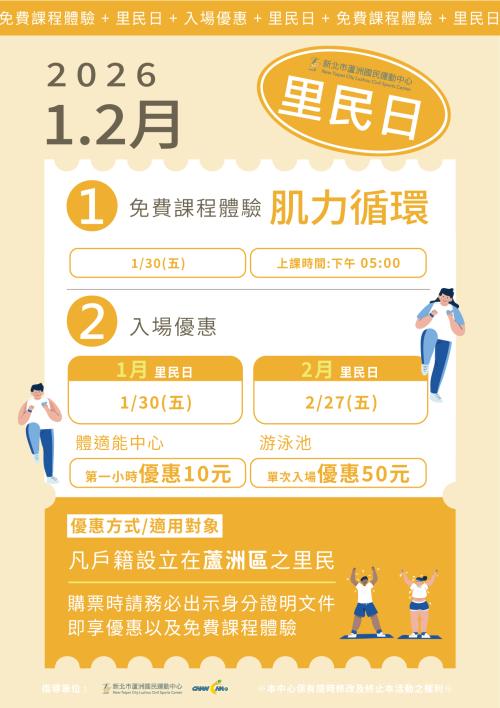 1-2月里民日-蘆洲居民專屬優惠 里民日當天至蘆洲運動中心即享 游泳池入場$10/次 體適能入場第一小時優惠$10 免費體驗課程 對象:戶籍地設立在蘆洲區的所有里民 使用方式:臨櫃出示身份證明文件 11月里民日為1/30(五) 12月里民日為2/27(五) 歡迎大家一起來中心運動