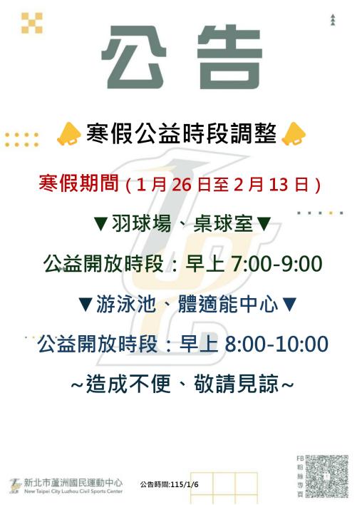 ?寒假公益時段調整? 寒假期間(1月26日至2月13日) ▼羽球場、桌球室▼ 公益開放時段:早上7:00-9:00 ▼游泳池、體適能中心▼ 公益開放時段:早上8:00-10:00 ~造成不便、敬請見諒~