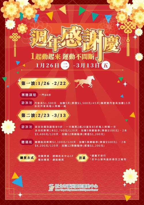 一起動起來,運動不間斷 活動分兩波進行: 第一波|1/26(二)-2/22(日) 團體課程優惠,一門88折 游泳池月會員加贈好康 (游泳池月會員每人限購一組) 第二波|2/23(一)-3/13(五) 游泳池個別課程/回數票優惠 體適能回數票加碼送 兩波優惠接力登場,錯過一波就少一波 詳細內容請見海報 歡迎至本中心 1F 櫃台或網路購買