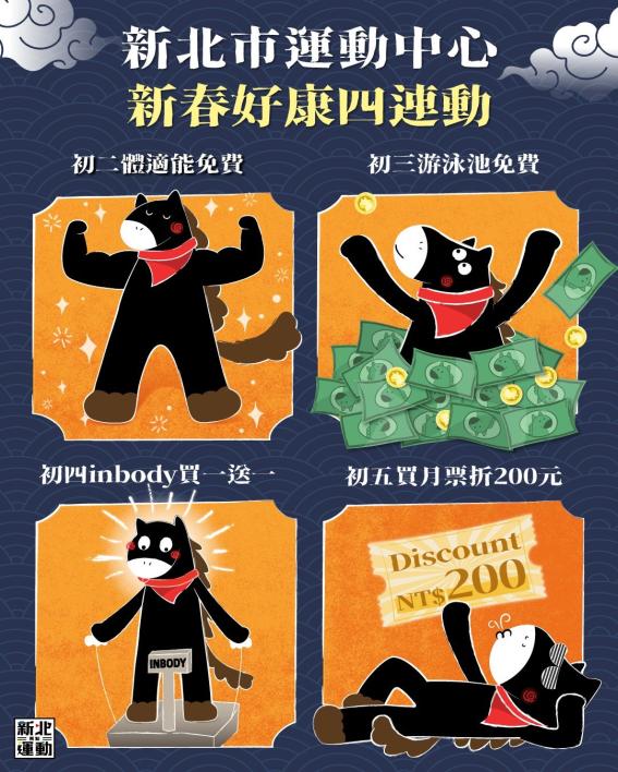 祝大家新年快樂!!!!! 運動中心與大家賀新年>< 準備了 #新春好康四連動 歡迎大家新年還是要動起來 #春節限定好康(初二~初五天天不一樣): 【馬上好運】初二|體適能免費 【馬上泳錢】初三|游泳池免費 【馬上加碼】初四|InBody 檢測買一送一 【馬上省錢】初五|購買月票現折 200 元 貼心提醒 2/16(一)~2/17(二)除夕初一公休 2/18(三)~2/21(六)營業時間為 08:00–17:00