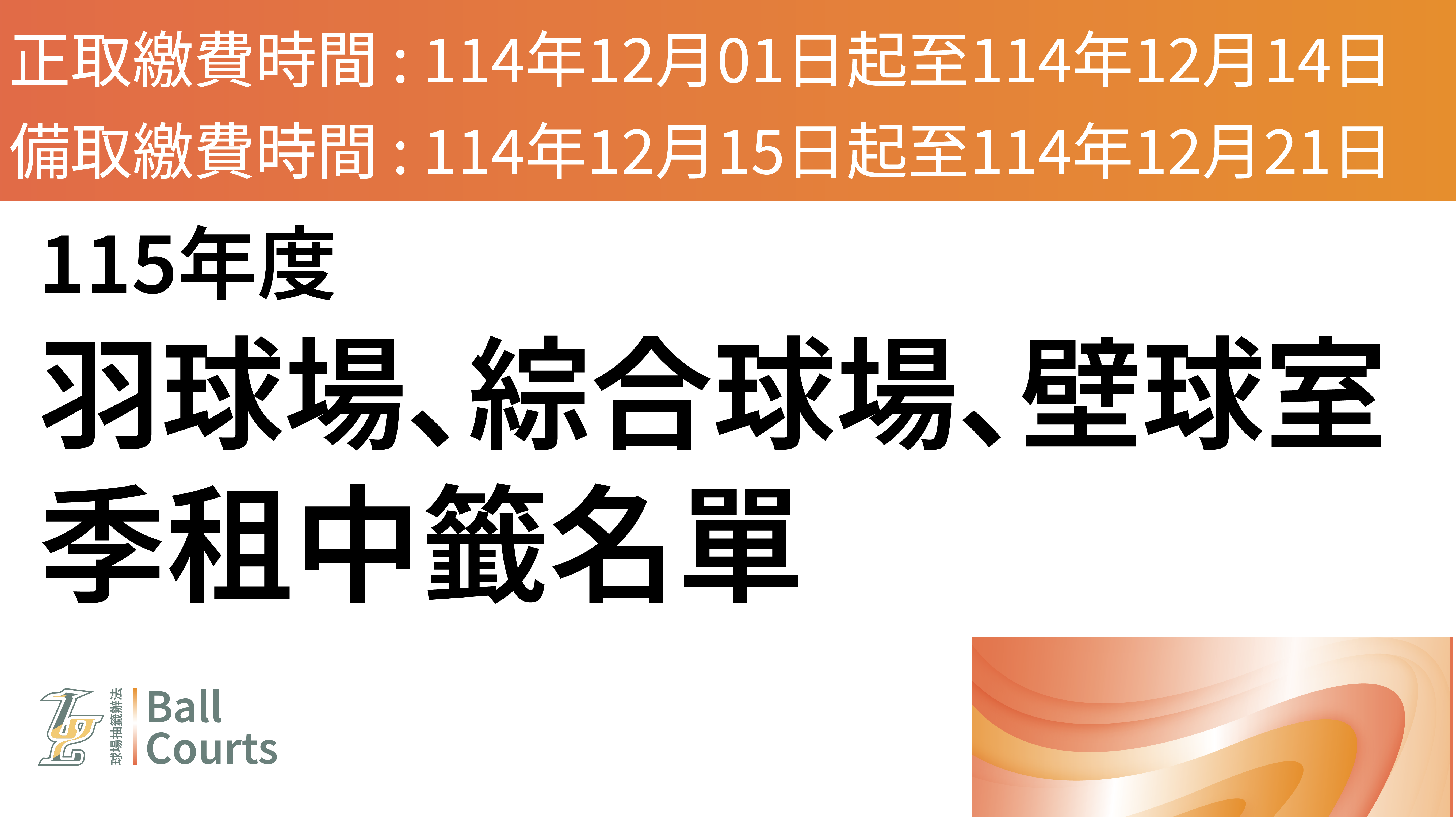 115年球場季租中籤名單 正取繳費時間 12/01(一)~ 03/02(日) 備取繳費時間 12/01(一)~ 03/02(日) ------------------------------------------------- ...